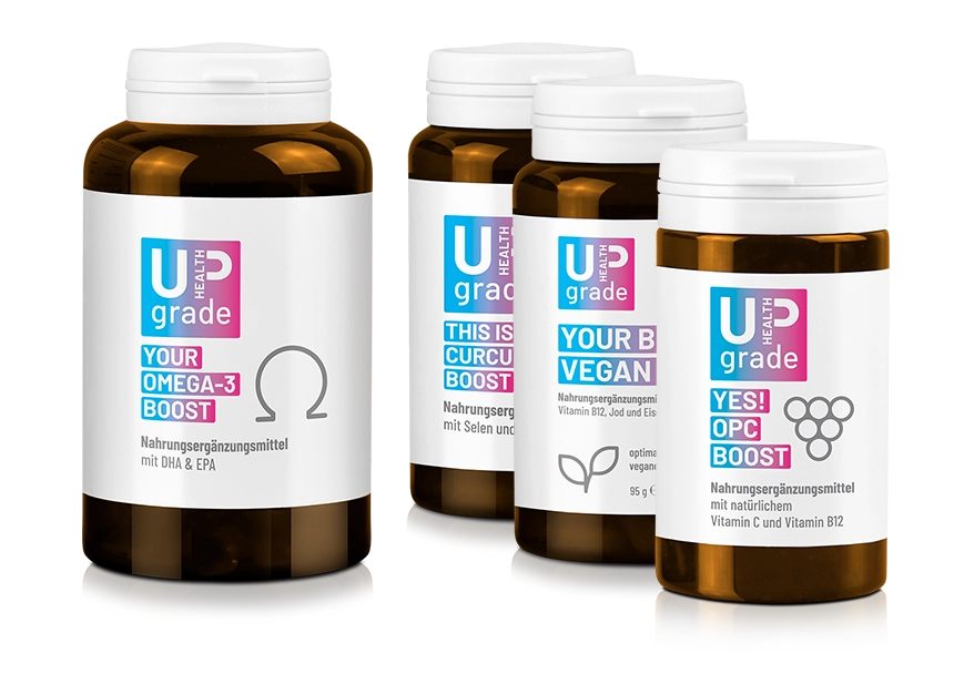 Decke Deinen Nährstoffbedarf natürlich und gezielt – mit Health Boostern für jeden Tag. YOUR OMEGA-3 BOOST versorgt dich mit ungesättigten Fettsäuren, THIS IS A CURCUMA BOOST bringt innere Balance, YES! OPC BOOST trägt dazu bei, deine Zellen vor oxidativen Stress zu schützen, und YOUR BEST VEGAN LIFE ergänzt Deine vegane Ernährung sinnvoll. Natürlich. Gut. HEALTH UPGRADE.