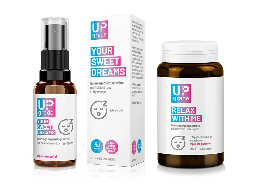 Lass den Tag sanft ausklingen und finde auf natürliche Weise zur Ruhe. RELAX WITH ME hilft Dir mit ausgewählten Inhaltsstoffen dabei, mental dich zu Erden und den Stress loszulassen. Für das entspannte Einschlafen sorgt YOUR SWEET DREAMS – ein hocheffizientes "Schlaf-Gut-Liquid", das Deinen Schlafrhythmus sanft unterstützt. Beide Produkte sind ideal für Deine abendliche Routine mit HEALTH UPGRADE.